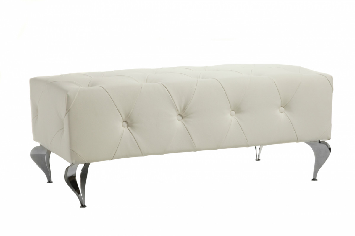 Оттоманка Hustle смонтирована из качественных комплектующих и обтянута чрезвычайно элегантной обивкой из белой экокожи, с применением декоративных пуговиц. Дизайн и декор способен украсить любое пространство вашего дома. Сочетание простоты и геометричности с изящной отделкой и ярким белым цветом привлекают внимание к этой изысканной оттоманке в стиле арт деко. Прямые линии корпуса подчеркиваются элегантными слегка изогнутыми ножками из нержавеющей стали.