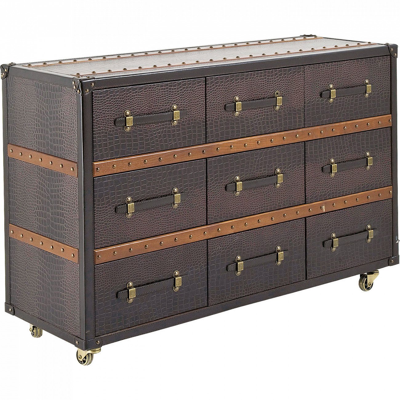 После путешествия по всему континенту или переходу Атлантического океана на пароходе, Вы возвращаетесь домой и видите классический интерьер путешественника. Такие комоды являются частью любимого интерьерного декорировани городских кочевников. Они излучают неповторимую ауру и элегантно воплощают стремление путешествовать к далеким берегам, в сочетании с духовным отношением к жизни и желанием смотреть далеко за пределы своих горизонтов. Благодаря своему космополитичному шарму такие люди у себя дома, а впрочем и везде, стараются окружить себя исключительно практичными вещами. Именно этот стиль жизни и вдохновил нас на создание комода Колониальный. Его многочисленные детали, такие как коричневая искусственная кожа под крокодила, оцинкованное железо на деталях комода, ручки, защитные уголкои и заклепки, теперь только напоминают о тех днях, когда путешествие было еще началом долгого приключения. В дополнение к своему очаровательному дизайну, у этого комода также имеется множество практических преимуществ. Девять ящиков располагают достаточным местом для необходимых вещей, в то время как колёсики делают комод мобильным и передвижным.