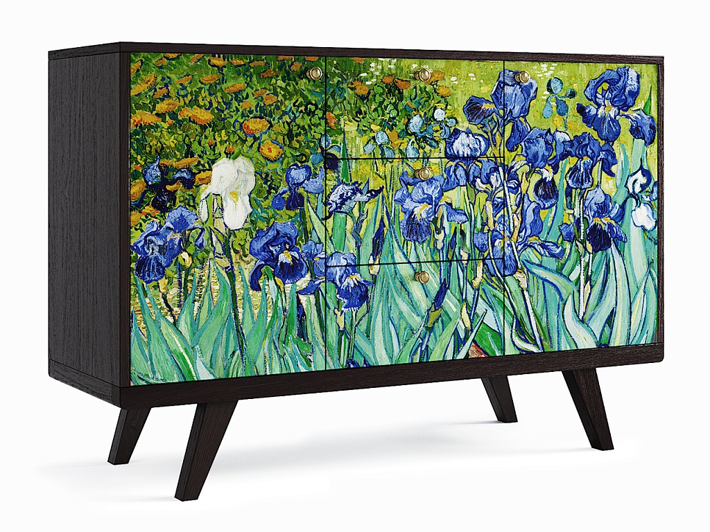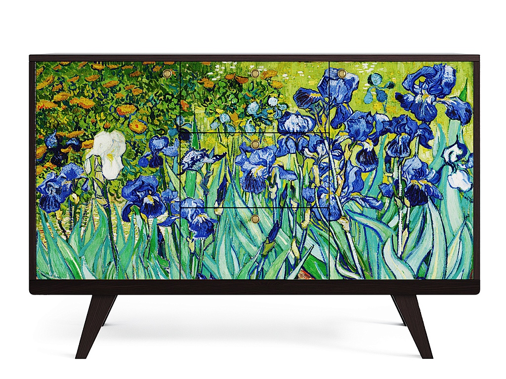 Комод Thimon с оригинальным декором фасадов и узнаваемым силуэтом, присущим стилю mid-century, неизбежно станет главным украшением интерьера. Комод отличается высокой функциональностью – удобные габариты и несколько ящиков позволяют использовать его для хранения личных вещей, а прочное основание из массива дуба выдержит самые весомые предметы.Особенности.Более 50 принтов в коллекции и 7 вариантов отделки корпуса, не влияющих на стоимость и срок изготовления. Европейские петли и направляющие с плавным закрыванием.Принты устойчивы к солнечным лучам и моющим средствам.Все фасады регулируются для аккуратной стыковки изображения.Корпус защищен матовым лаком.Ножки установлены с отступом для плинтуса.Легко установить любые ручки-кнопки.Материалы.Основание – массив дуба.Корпус – МДФ, натуральный шпон дуба.Фасады – МДФ.Ящики и полки – ЛДСП, светло-серый.Фурнитура – петли и направляющие с доводчиками, стальные крепежные элементы. Покрытие – тонировка, матовый лак, эмаль, принт. Комод THIMON Дуб венге / Принт 004