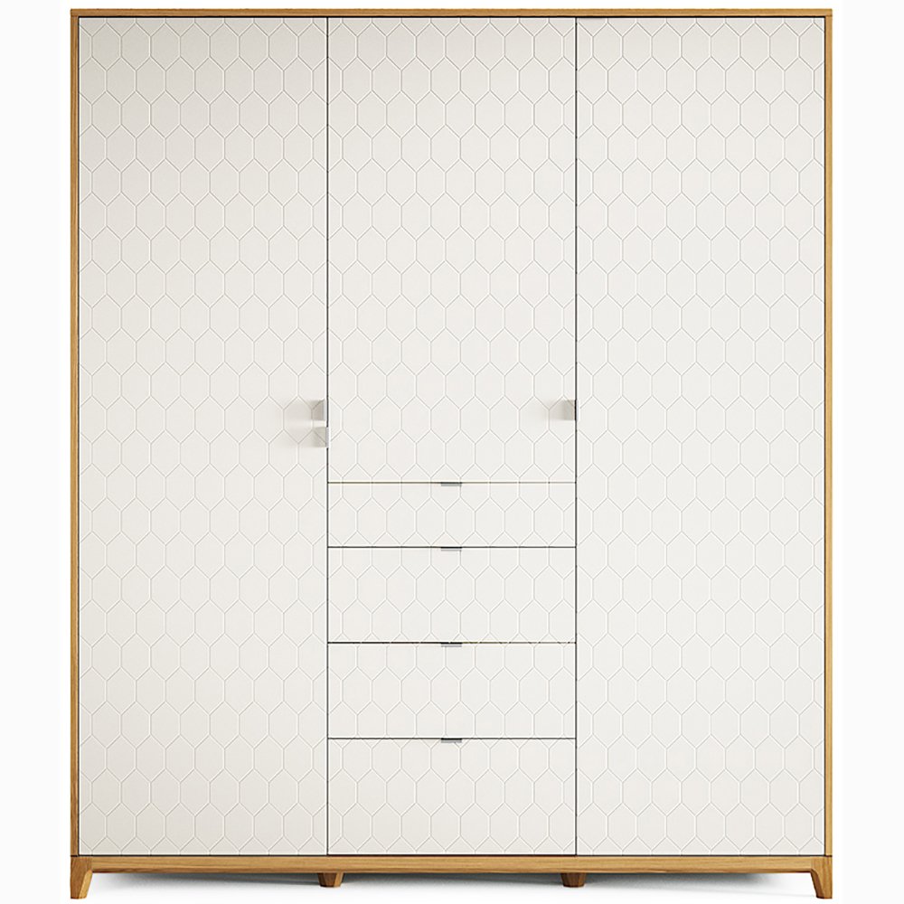 Самый вместительный шкаф в коллекции Case. Его конструкция выгодно отличается от других моделей – для большего удобства средняя секция с полками и выдвижными ящиками изготовлена с отдельными фасадами. Кроме того, предусмотрены отверстия для изменения высоты полок и штанг для одежды.Особенности.В комплекте поставляется дополнительная полка и штанга для вешалок.Более 2500 сочетаний отделок, не влияющих на стоимость и срок изготовления.Все фасады регулируются в трех плоскостях для аккуратного выравнивания узора гравировки.На ящиках установлены направляющие Blum скрытого монтажа с доводчиками.Износостойкие каркасы ящиков из ЛДСП выдерживают вес до 30кг каждый.Сплошная перфорация позволяет устанавливать полки в каждой секции в удобном положении.Предусмотрено крепление к стене.Полки и перегородки из прочного и экологичного ЛДСП.Усиленная конструкция основания из массива дуба.Возможен заказ шкафа без гравировки фасадов.Изготавливаем в индивидуальном размере.Материалы.Основание – массив дуба.Корпус – МДФ, натуральный шпон дуба.Фасады – МДФ.Ящики, полки и перегородки – ЛДСП, светло-серый.Фурнитура – петли с плавным закрыванием, направляющие Blum с доводчиками, стальные крепежные элементы. Ручки – алюминий.Покрытие – тонировка, лак, эмаль.