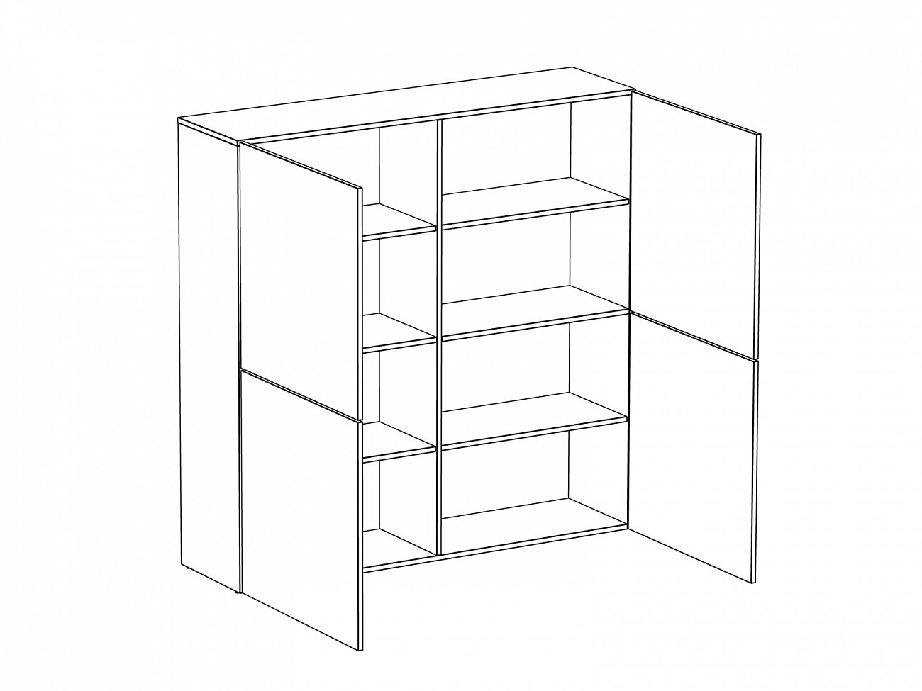 Фасад шкафа состоит из четырех распашных дверей, открывающихся по принципу «нажал-открыл». Шкаф имеет четыре отделения, в каждом отделении расположена съемная полка с возможностью переустановки по высоте. Задняя стенка черного цвета.