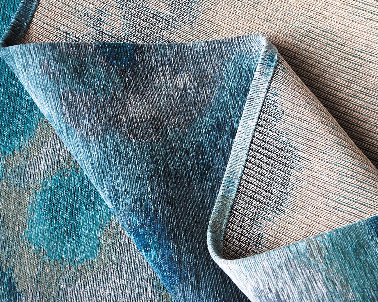 Ковер ALINA DELPHI - яркая абстракция в модной цветовой гамме. Сочетание насыщенных синих и бирюзовых тонов, с одной стороны, успокаивает и расслабляет, даря ассоциации с морем и свежестью, а с другой – делает интерьер притягательным и стильным. Современны и интересны комбинации декоративного ковра с мебелью и аксессуарами спокойных природных оттенков дерева и бело-серо-бежевым цветом гальки.